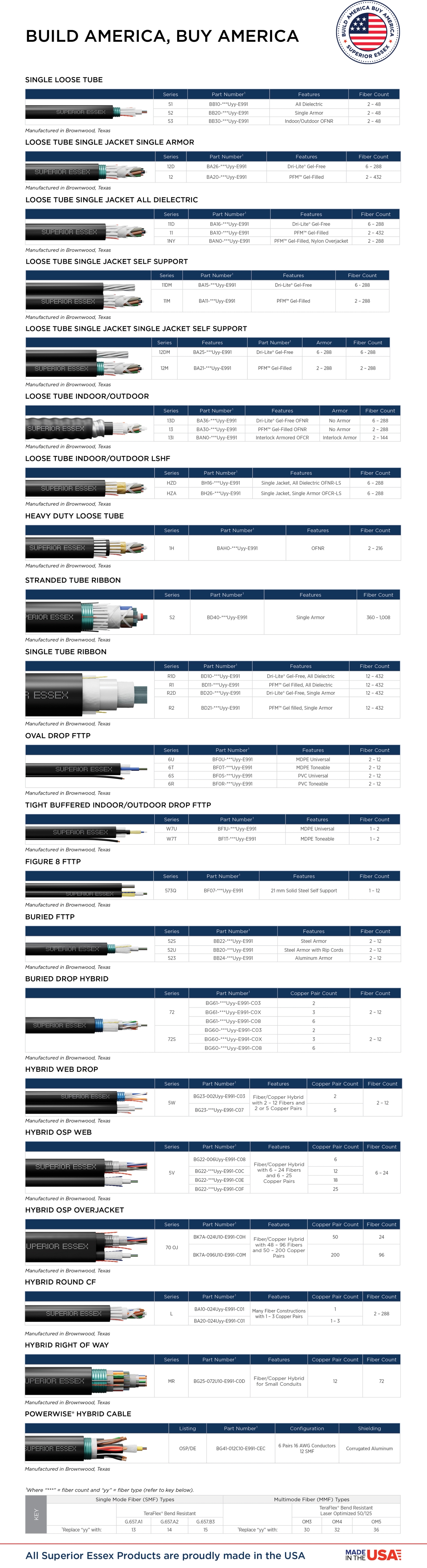 Superior Essex Communications certifies that the fiber optic cables listed below comply with the requirements of the Build America, Buy America Act as part of the Infrastructure Investment and Jobs Act (IIAJ), Pub. L, 117-58, 135 Stat. 429, 70901-70927. All fiber cable manufactured under a “BABA” cable part number will use BABA compliant optical fiber that is manufactured in Concord, North Carolina and Wilmington, North Carolina.