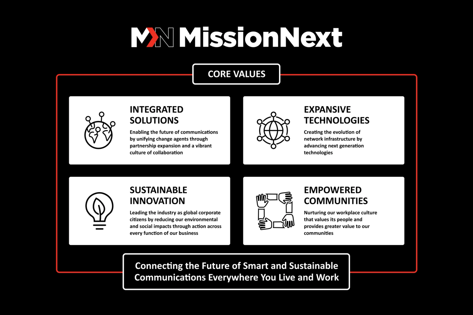 The MissionNext program stands on the pillars of four fundamental core values: Integrated Solutions, Sustainable Innovation, Expansive Technologies, and Empowered Communities. In alignment with each value, we have developed specific goals, metrics, and action plans to guide our journey. These will serve as both a mechanism of accountability for our stakeholders, employees, and communities, ensuring we uphold our commitments, as well as a strategic pathway that will guide Superior Essex Communications into the future.
